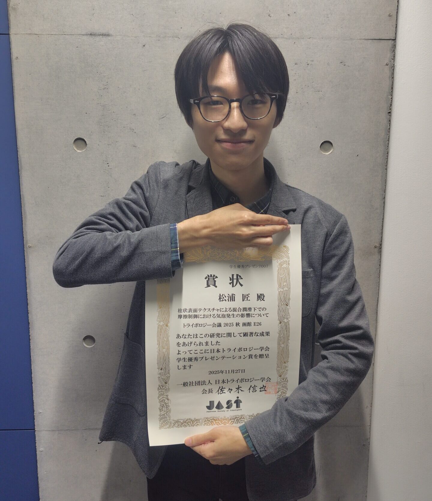 2025年10月 日本トライボロジー学会 トライボロジー会議 2025 秋 函館 学生優秀プレゼンテーション賞 松浦 匠