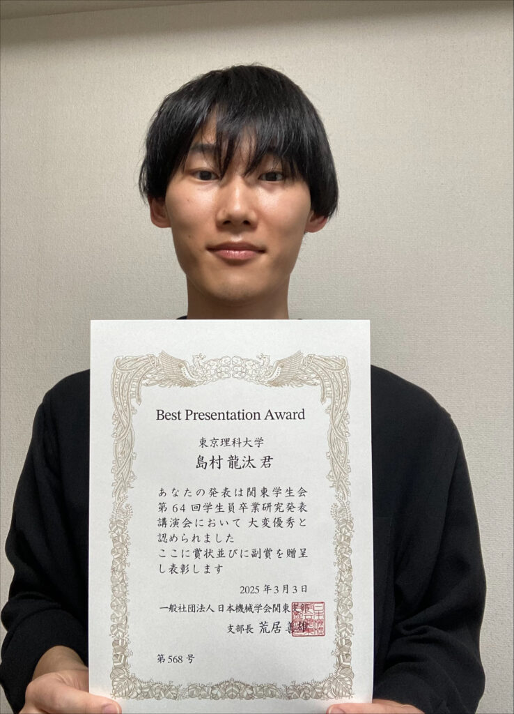 2025年3月 日本機械学会関東支部 Best Presentation Award 島村 龍汰